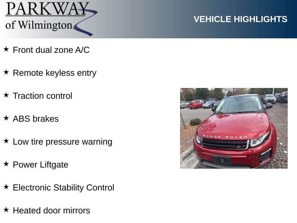 Firenze Red Metallic 2018 Land Rover Range Rover Evoque SE Premium 4WD 9-Speed Automatic 2.0L Turbocharged ABS brakes, Alloy wheels, Electronic Stability Control, Front dual zone A/C, Heated door mirrors, Illuminated entry, Low tire pressure warning, Power Liftgate, Remote keyless entry, Traction control.